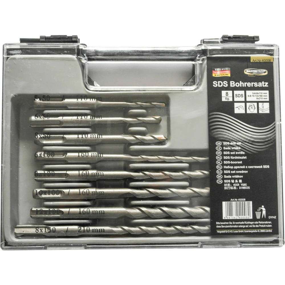 In diesem SDS-Hammerbohrer-Set findest du die gĂ€ngigsten GröĂen in verschiedenen LĂ€ngen. Zur praktischen Aufbewahrung kommt das Bohrerset in einer Kunststoffbox zu dir. Ein Bohrerset, an dem du lange Zeit Freude haben wirst. Das SDS-System ist ein 4-Nut-Standard mit speziellen Rillen, die eine bessere KraftĂŒbertragung gewĂ€hrleisten. Das System ermöglicht einen werkzeuglosen und schnellen Wechsel von Bohrern und MeiĂeln. Die Bohrer haben je zwei extra gehĂ€rtete SchneidflĂ€chen, so lassen sich diese sehr exakt an der gewĂŒnschten Bohrstelle ansetzen.