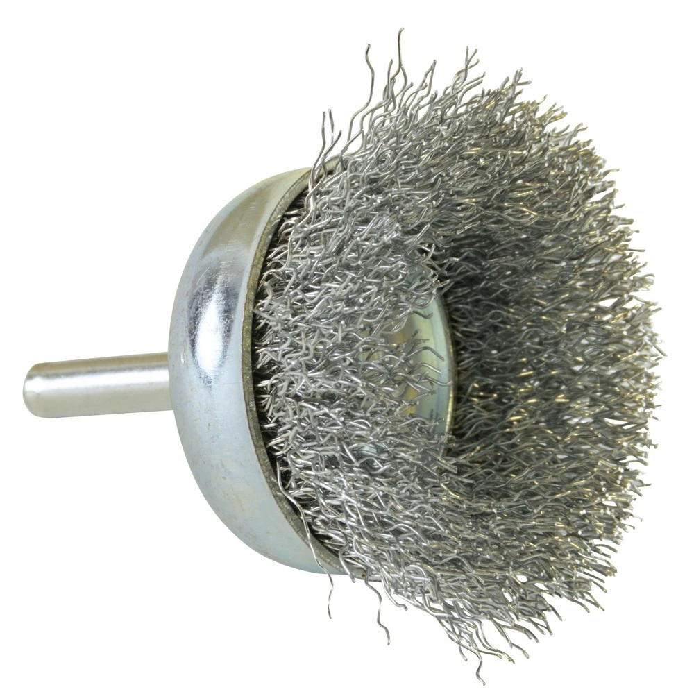 Grobe Topfbürste mit einem Durchmesser von 50 mm und gewelltem Draht, ideal zum Reinigen, Entrosten und Entgraten von Werkstoffen wie Metall, Stein oder Holz. Die Topfbürste ist universell für alle Bohrmaschinen geeignet. Der Aufnahmedorn hat einen Durchmesser von 6mm. Auch für die Vorbereitung von Löt- und Schweißarbeiten geeignet.